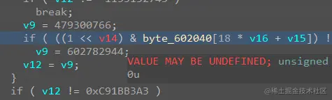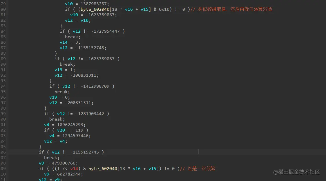 这里知道了input的长度,然后看效验函数 sub_4005A0 ,打开是一个多层的循环,先找点有用的东西。发现两个if语句和某数组相关。