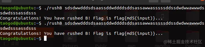 printf("Congratulations! You have rushed B! Flag is flag{md5(input)}...\n");