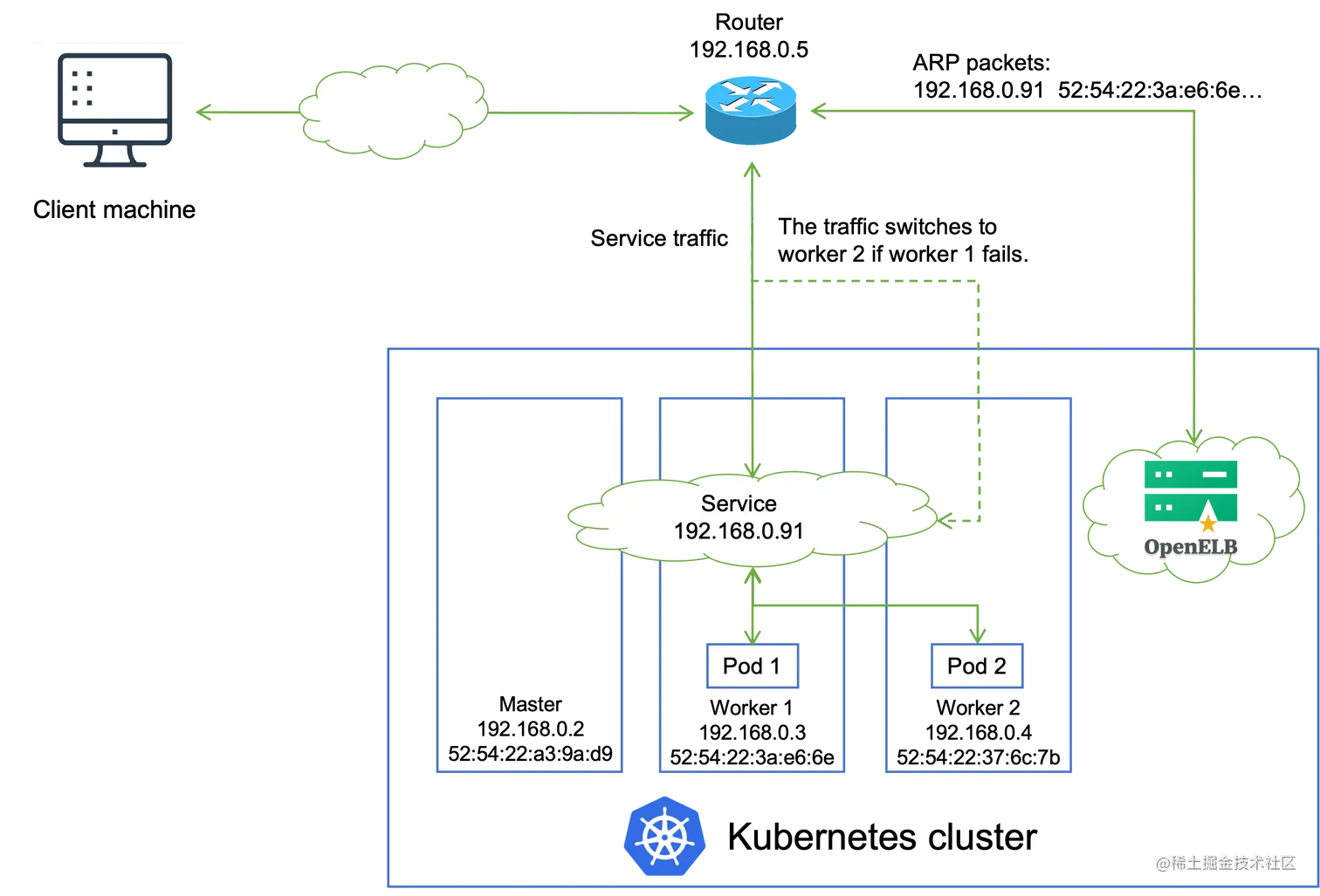 OpenELB 正是利用 ARP 欺骗技术,从而获取路由器流量,再由 kube-proxy 将流量转发到 Service 网络。OpenELB Layer2 模式需要配置 EIP,如上图所示的 EIP 为 192.168.0.91。