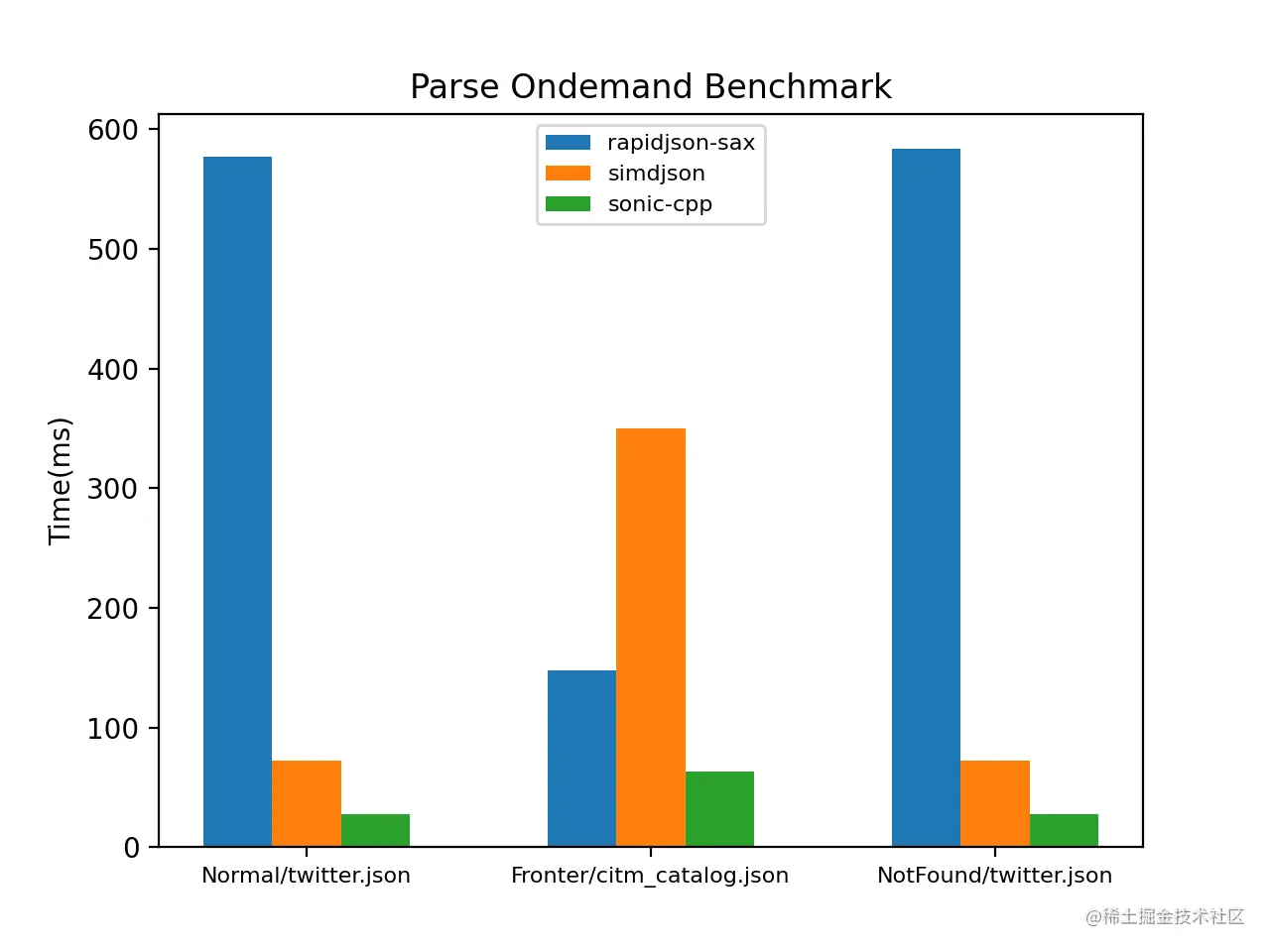 经过全场景测试,sonic-cpp 的按需解析明显好于已有的实现。性能测试结果如下图。其中,rapidjson-sax 是基于 rapidjson 的 SAX 接口实现的,使用递归下降法实现的按需解析。simdjson 的按需解析则是基于两阶段处理的方式实现。Normal,Fronter,NotFoud 则分别表示,按需解析时,目标字段 在 JSON 中的位置居中,靠前或不存在。不过,使用 sonic-cpp 和 simdjson 的按需解析时,都需要保证输入的 JSON 是正确合法的。