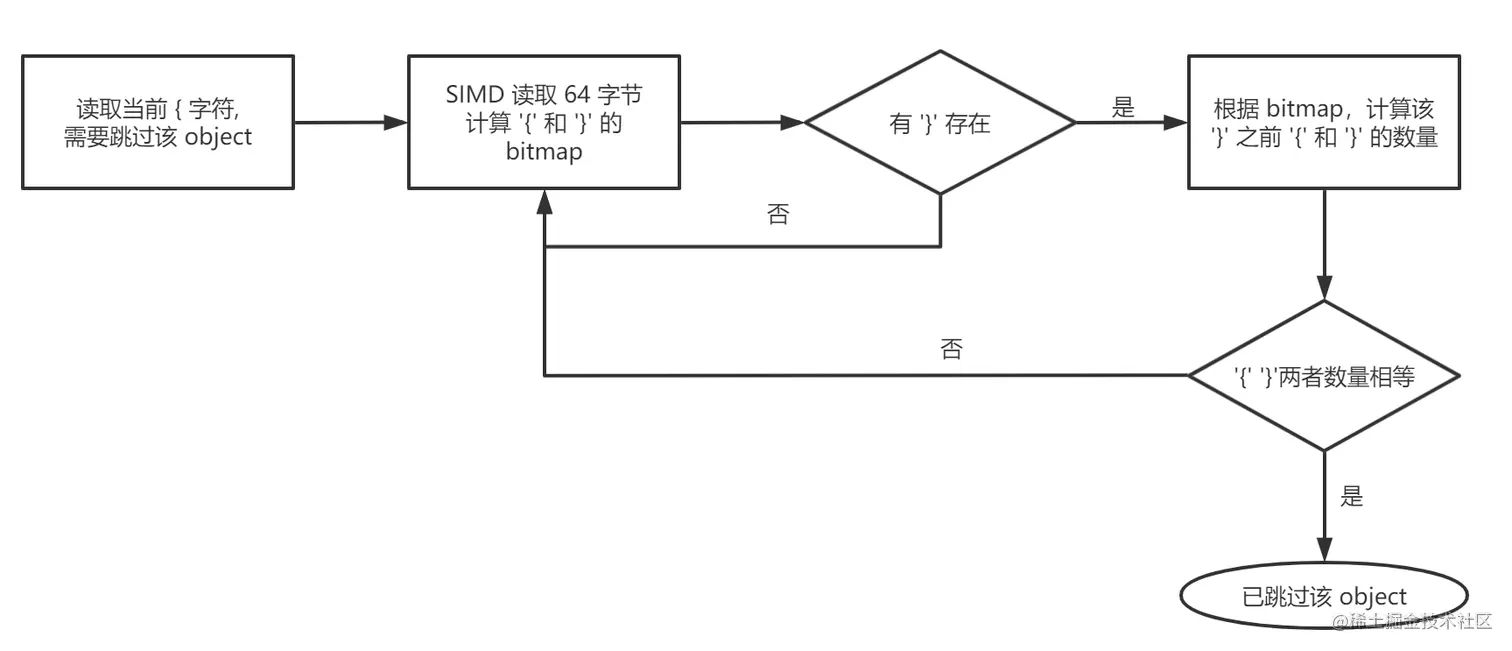 sonic-cpp 基于 SIMD 实现了高性能的单阶段的按需解析。在按需解析过程中,核心操作在于如何跳过不需要的 JSON object 或 array。sonic-cpp 充分利用了完整的 JSON object 中 左括号数量必定等于右括号数量这一特性,利用 SIMD 读取 64 字节的 JSON 字段,得到左右括号的 bitmap。进一步,计算 object 中左括号和右括号的数量,最后通过比较左右括号数量来确定 object 结束位置。具体操作如下: