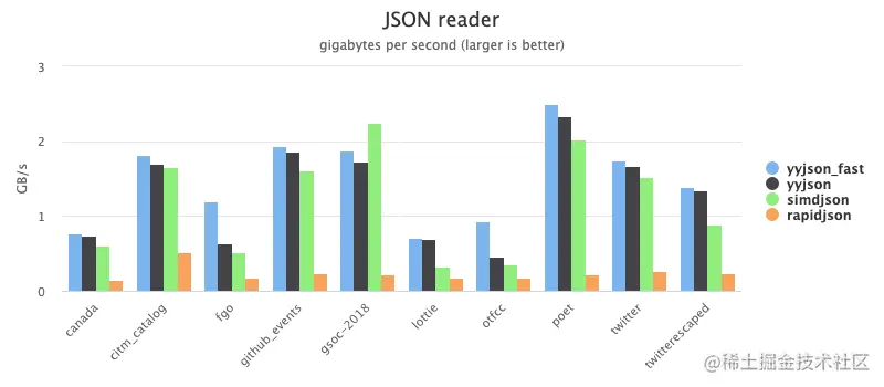 图 1.1 yyjson、simdjson 和 rapidjson 解析性能对比