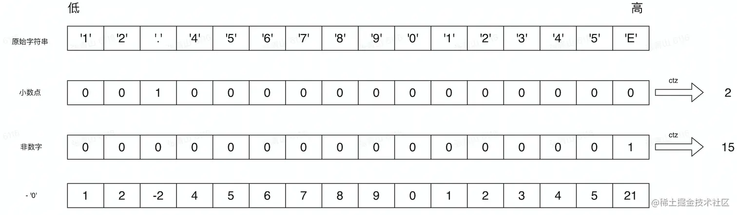 和序列化向量化类似,通过同样的向量指令得到小数点和结束符的位置,再把原始字符串通过向量减法指令,减去'0', 就得到真实数值。