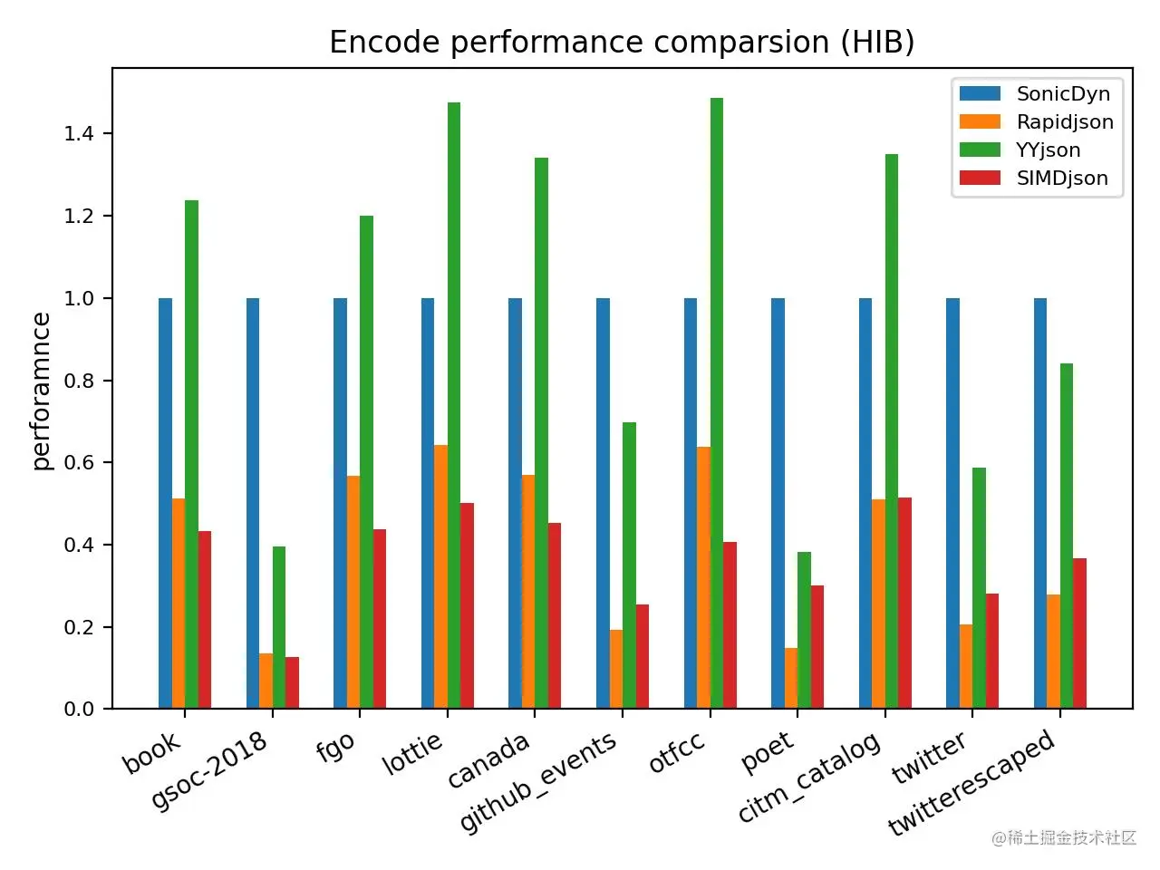 sonic-cpp 与 rapidjson,simdjson 和 yyjson 之间在不同场景的性能对比(HIB: Higher is better)。