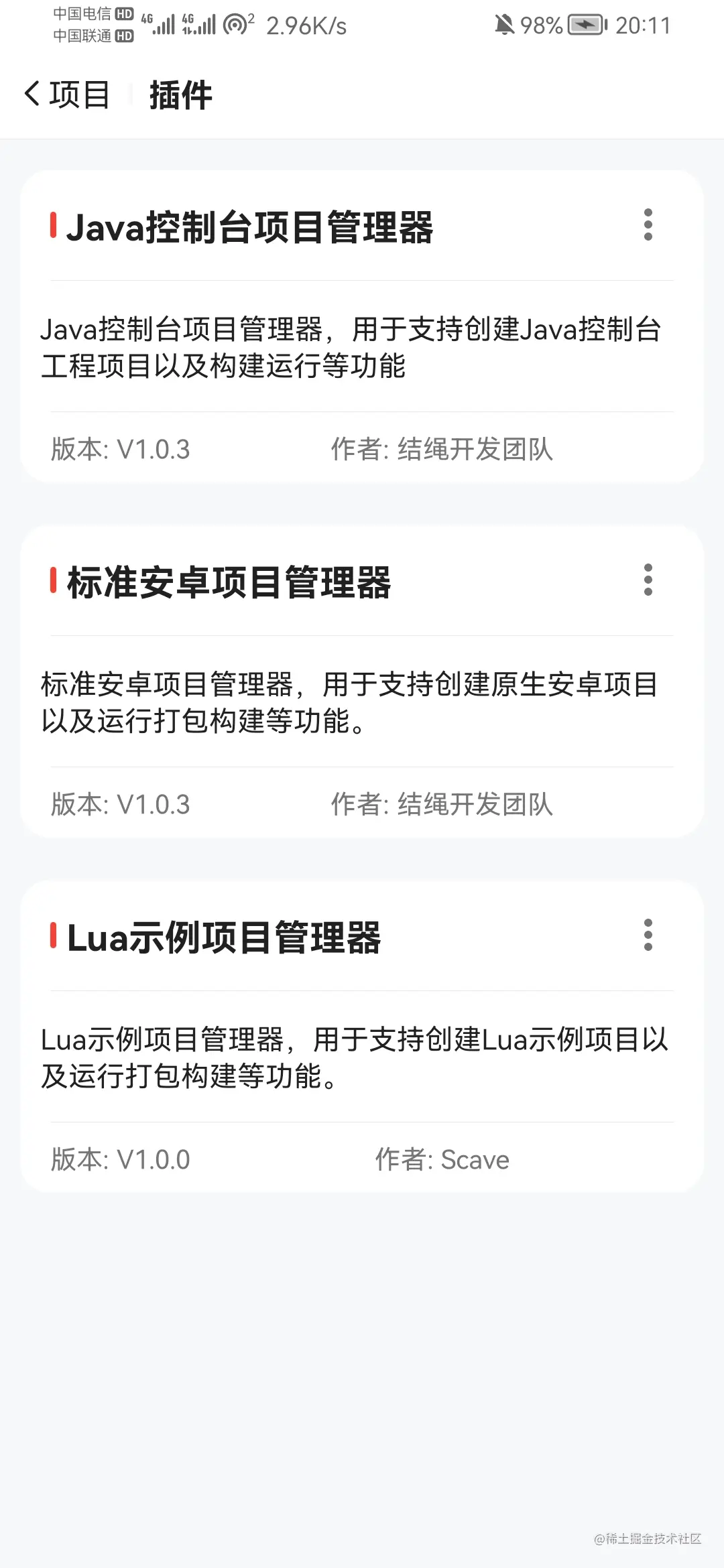 结绳具有充足的扩展性,可以装载不同类型的插件,以补充结绳功能上的不足(如:原生Android项目插件、PHP项目插件等)。