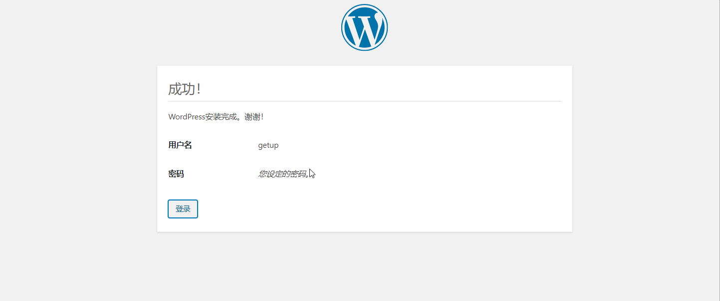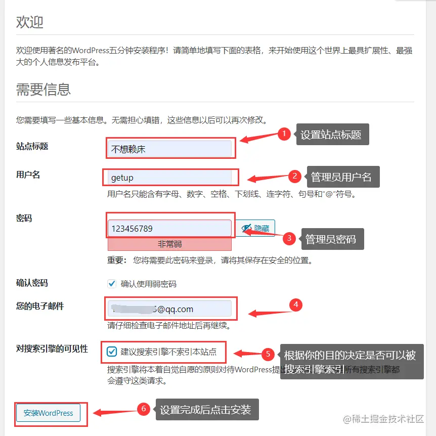 选择“简体中文”->“继续”。 设置站点标题、用户名、密码及电子邮件后,点击“安装WordPress”,如下图所示:
