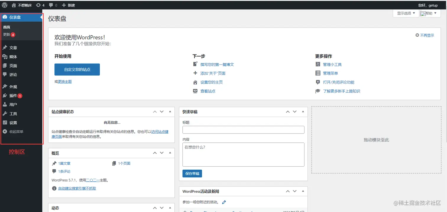 wordpress后台界面仪表盘,在这里我们可以进行设置站点标题,发布文章,管理主题,对用户进行管理等功能