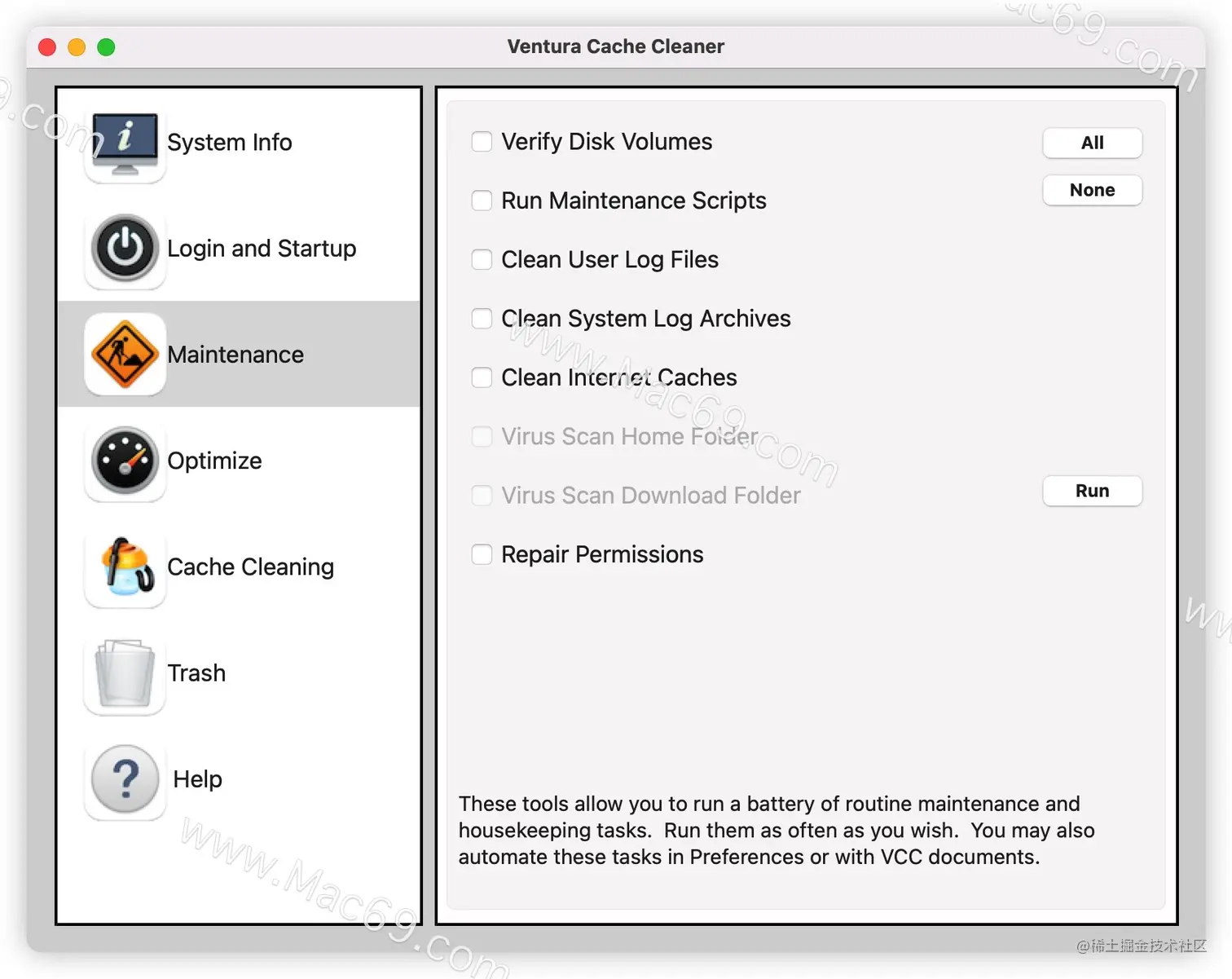 Ventura Cache Cleaner 是满足您所有 macOS X 维护需求的一站式解决方案。Intel 或 PPC、Tiger 或 Ventura,VCC 拥有使您的系统保持最佳运行状态的工具。VCC 文档和 VCC 引擎通过提供常见维护工作的完全自动化来维护系统健康,包括互联网下载的病毒扫描。VCC 引擎甚至可以在软件安装后自动修复权限。使用 VCC 引擎,