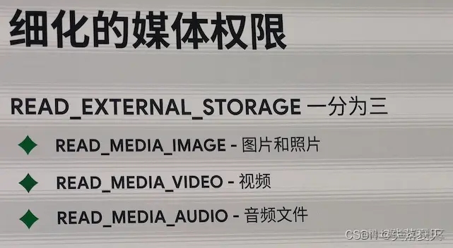 但是Android13之后,这个权限被细化成了三个,也就是说,这是三个权限需要分别单独去申请了。