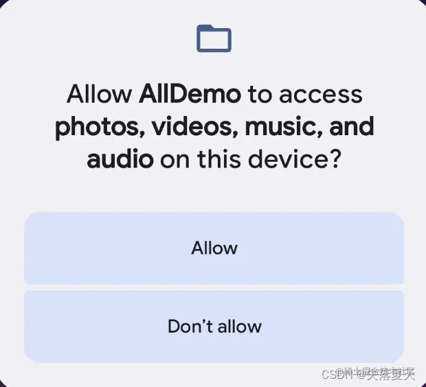 如果是升级Android13之后新装的应用,并且targetSDK小于33,则申请READ_EXTERNAL_STORAGE权限时,会自动转化为对上述三个权限的申请,权限申请框只一个