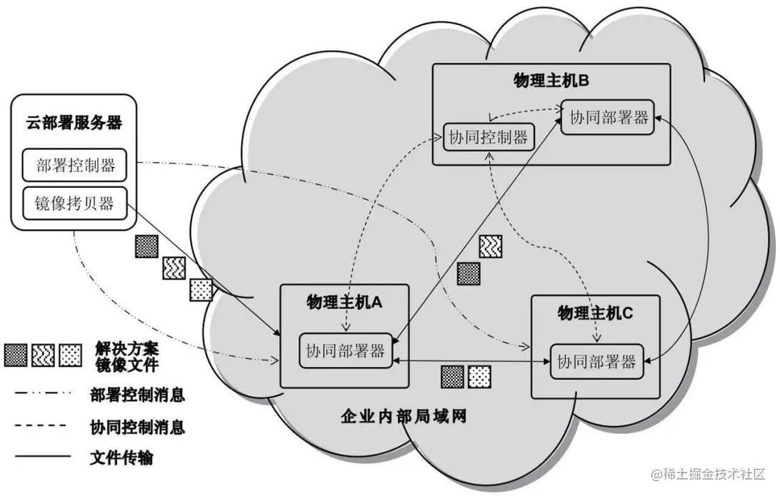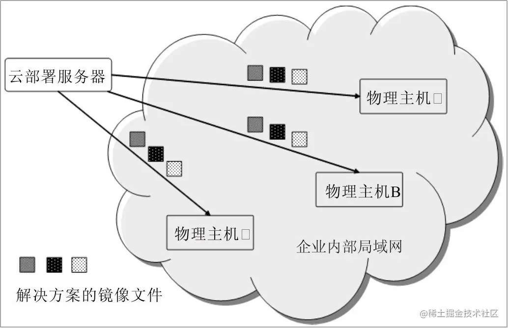 并行部署和协同部署技术同样可以运用到物理解决方案的自动化部署过程中,加速部署过程。为了能够自动化部署物理解决方案,需要定义一种标准的解决方案打包格式,将软件程序文件、安装配置脚本、元数据等内容一起打包还需要一个通用的部署引擎和一组自动化安装配置流程。通过这种方式,部署引擎在接收到解决方案的打包文件以后,能够解析解决方案的元数据,按照自动化流程驱动整个解决方案的安装配置过程。