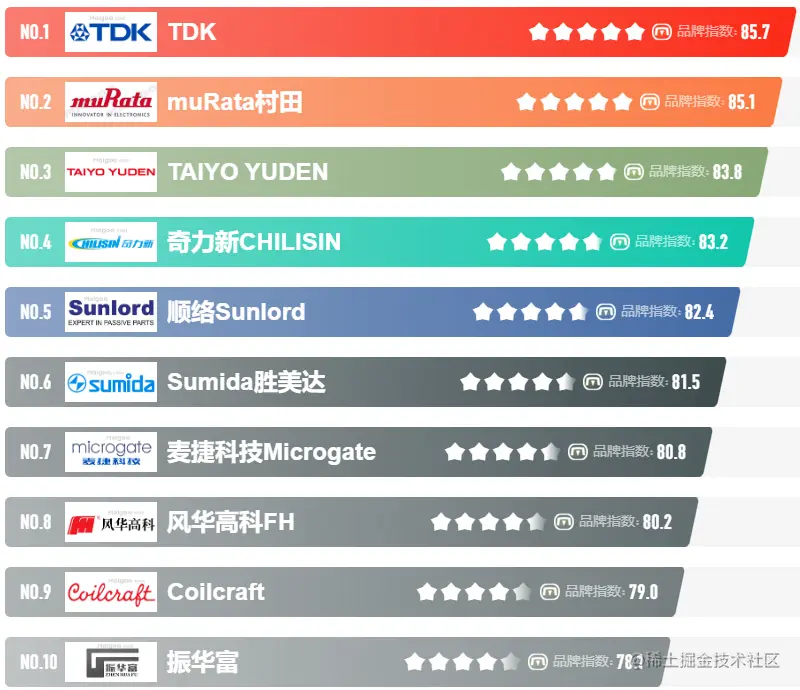如下是2022年Top10的电感品牌指数,都是在电子行业深耕多年的企业,对于工程师做选型时,如果价格不受限制,那么选择大品牌肯定没错。
