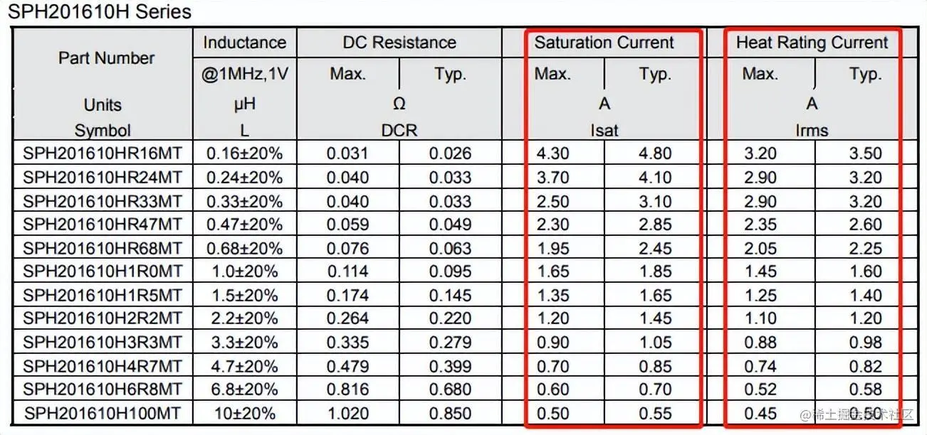 如下图所示,功率电感中有两个额定电流,Saturation Current 饱和电流和Heat Rating Current温升电流,在实际选型中我们是以那个为选型依据呢?