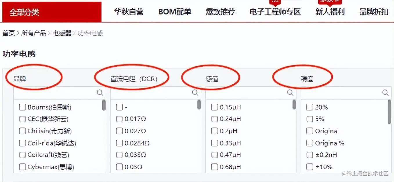如下图所示功率电感的关键参数有:品牌、直流电阻(DCR)、感值、精度、额定电流、自谐振频率、工作温度、封装等参数。