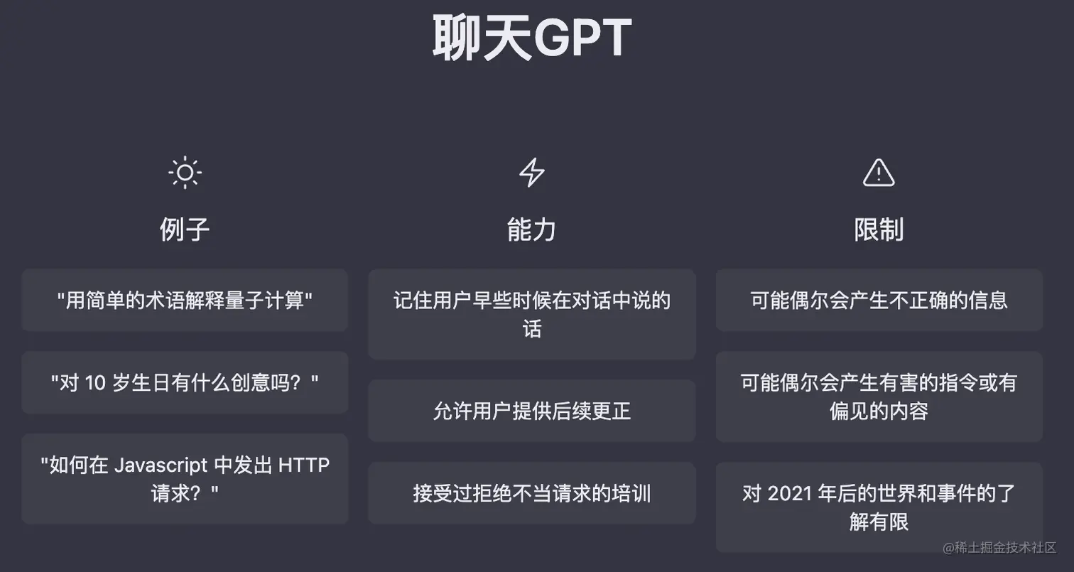 例子(Examples)和能力(Capabilities)自然不用介绍啦,大家都明白。这里要说明一下限制(Limitations),当然ChatGPT可能给出一些不正确或者有偏见的内容, 这个大家也都理解,毕竟AI也不是万能的。此外还有一个就是对2021年后的世界和事件的了解有限,也就是时间有限制,ChatGPT不能快速了解当下发生的一些事情,这个大家使用一定要注意。