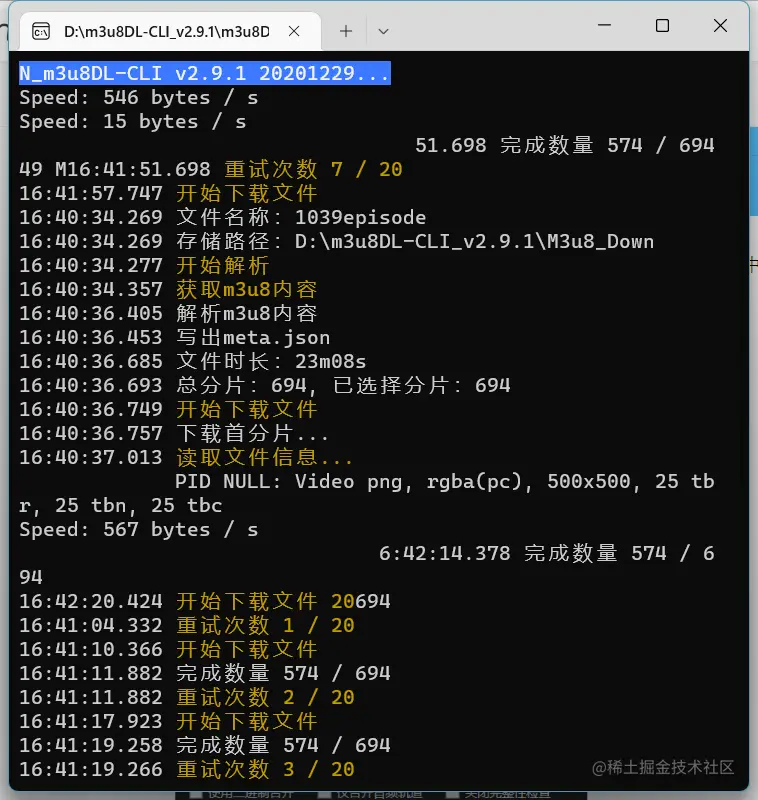编辑 方式2、利用m3u8下载器N_m3u8DL-CLI-SimpleG:打开网页“检查”找到了m3u8文件(如果不知可以先去百度搜索),将m3u8网址复制到下载器中,无果!会出现卡顿在某个ts片段就运行不了了,如下图卡在第574个ts文件就下载不了了,重试也无用!