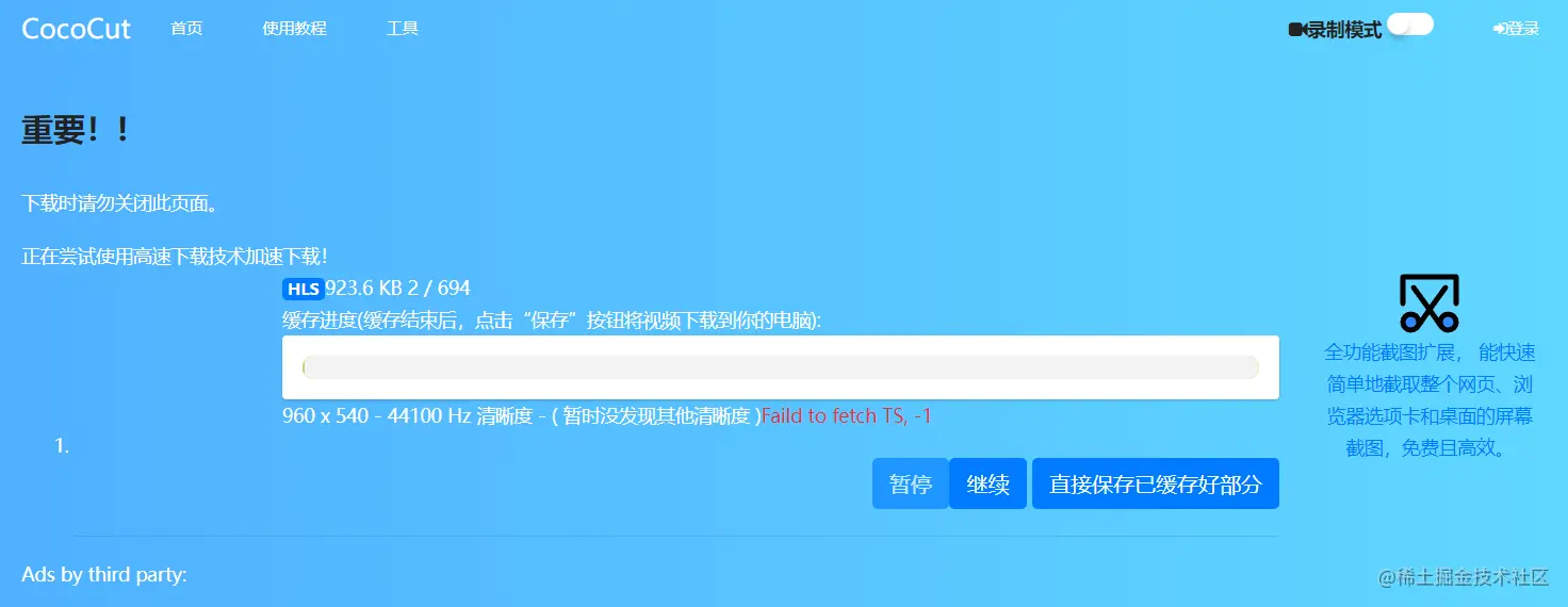 背景:对于一个要看海贼王的海迷来说,每周更新的海贼王是必不可少的下饭菜,但正规渠道的高清资源爱奇艺需要充值会员...只为了一个月看4次海贼王就充值一个月会员实属让我不爽~ 无意中发现一个宝藏网站:wujicloud.cn,刚好有我需要的海贼王,而且有最新集!!!支持在线观看,但看到1039集发现视频总是加载不出来,但点击进度条又能加载个2秒,无法顺畅播放!于是我就尝试了以下几种办法去下载视频。 方式1、利用网页扩展软件CocoCut:直接报错,下载不了。(原因在后面)