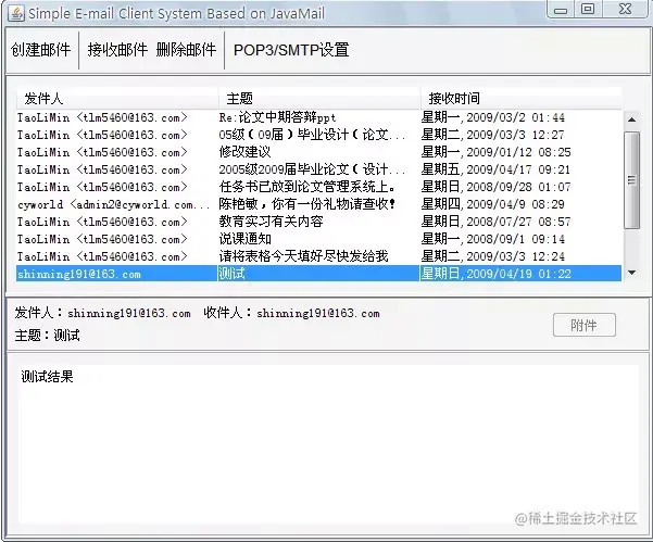 上面使用javamail API所实现的邮件客户端程序具备了一个Email收发系统的基本功能,在此基础上,可以进一步添加其它的功能,比如转发邮件、回复邮件等,使其成为一个功能完善的邮件客户端系统。