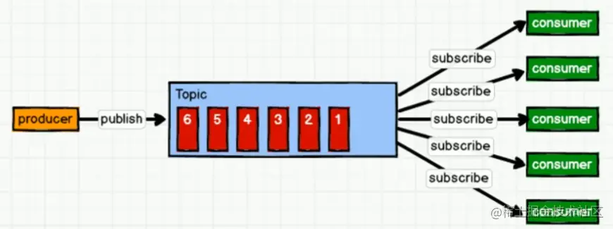 - 发布/订阅模式: 一对多,消费者消费数据之后不会清除消息。消费者(发布)将消息发布到 topic 中,同时有多个消息消费者(订阅)消费该消息。和点对点的方式不同,发布到 topic 的消费被所有订阅者消费。