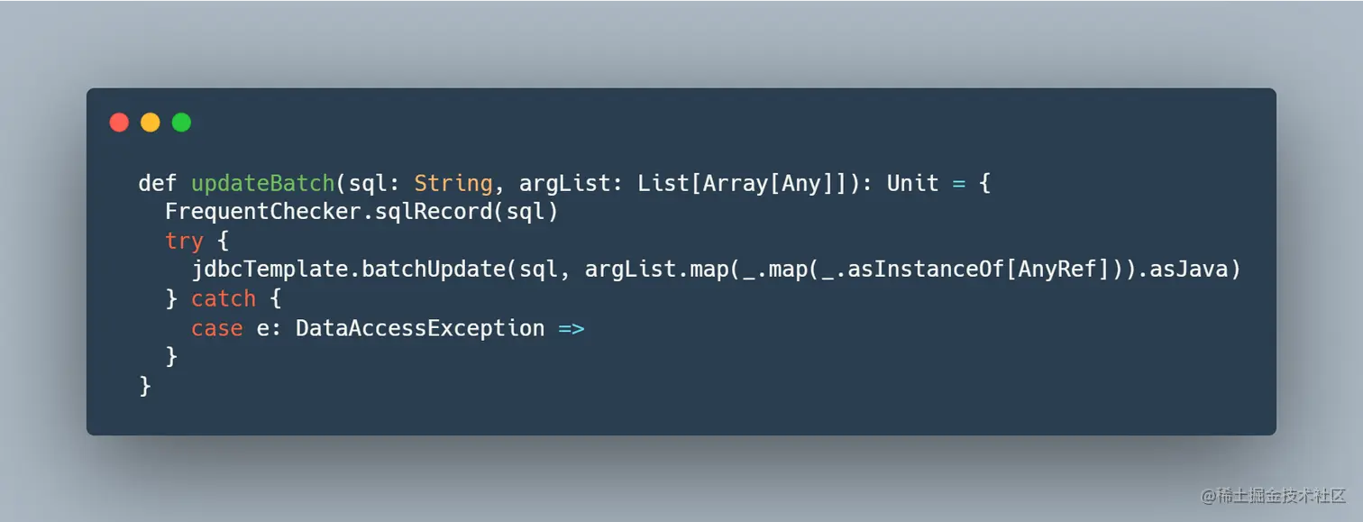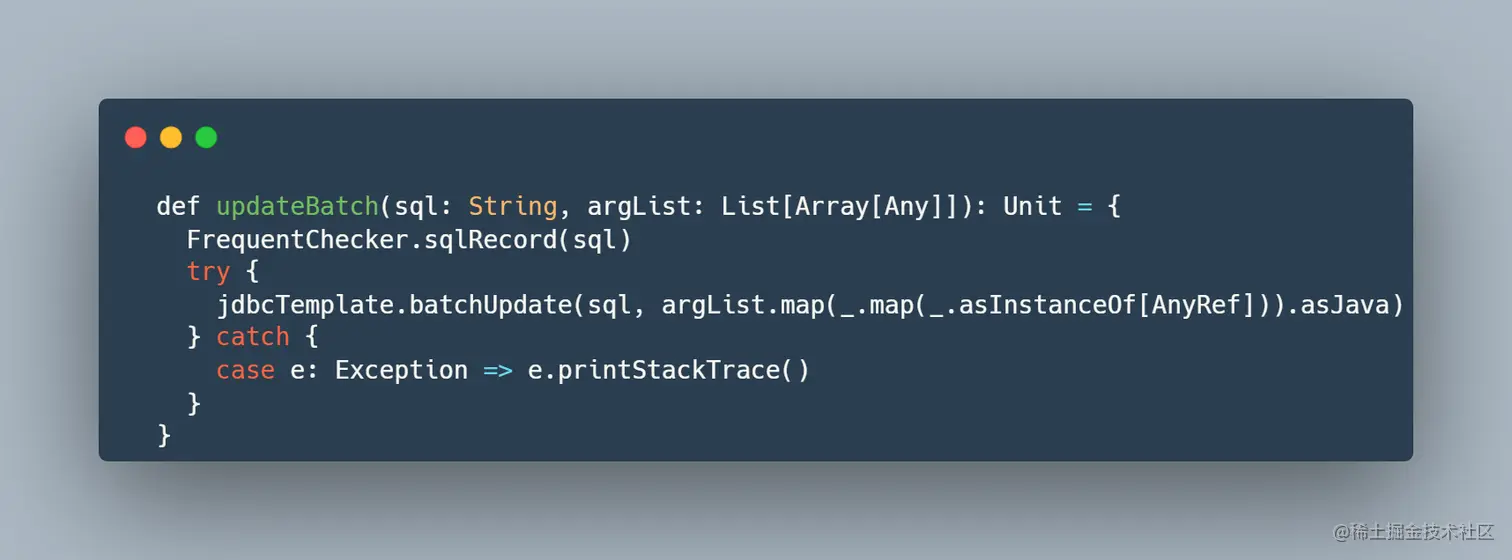case e: Exception => logger.error(s"updateBatch error, sql: ${sql}, error message: ${e.getMessage}")