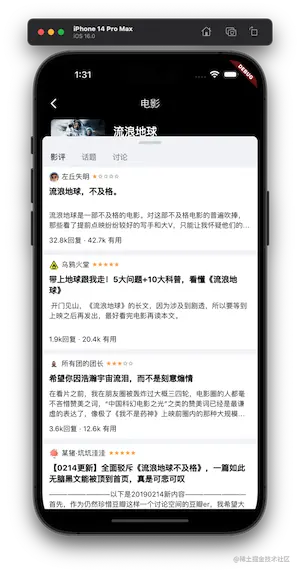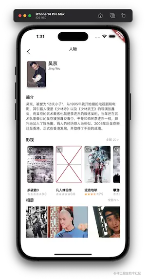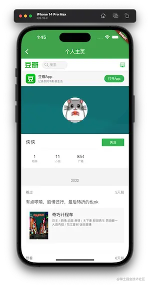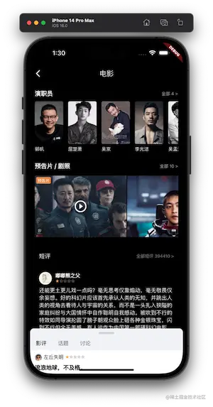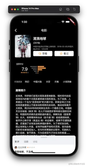 在书影音、小组的列表中点击任何一个电影都会跳转到一个电影详情页面 DetailPage,这里的电影详情数据都使用了本地的 json 数据。