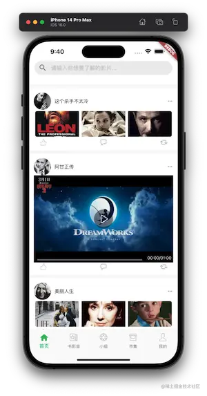 HomePage 是一个非常经典的 App 页面,顶部是一个搜索框,下面是一个滚动列表,包括两种样式的 cell,一种是并排三张图片,一种是一个视频播放器。关于这个滑动列表我们用到了一个比较复杂的 Widget: NestedScrollView。