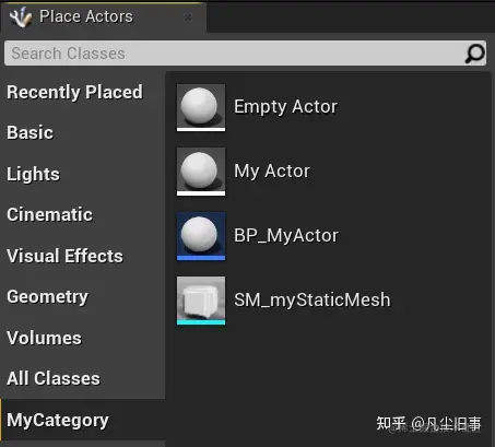 扩展 UE4 的 PlaceActors 窗口,便于我们自定义的资产/工具(StaticMesh,BP...)直接拖拽到窗口中。