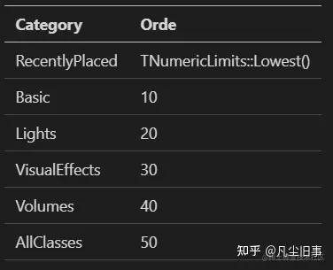 FText InDisplayName:显示的名字就是和 RecentlyPlaced,Basic,Lights... 并列的名字FName InHandle:分类的句柄FString InTag:不清楚有什么用,有大佬知道的还请告知int32 InSortOrder:分类所在的位置,默认 0 的话会排在 RecentlyPlaced 下方bool bInSortable:规定了该分类下的 item 是否自动排序