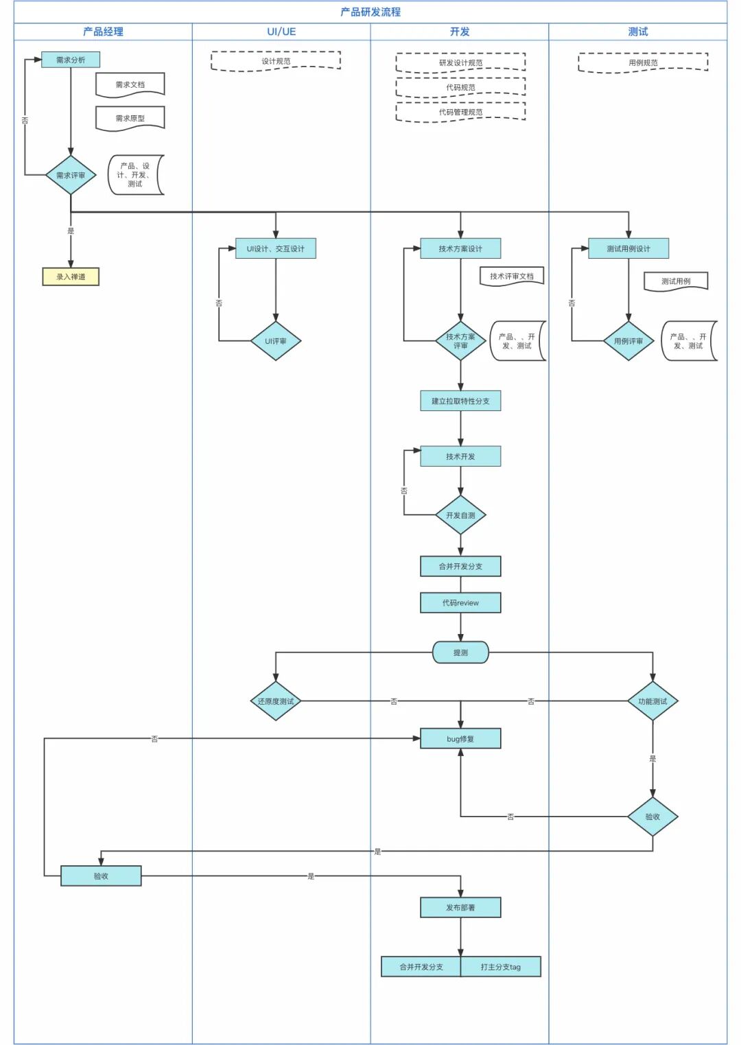 研发流程规范,指的是一个需求从提出到完成的整个过程应该是怎样流转的。一般的需求研发流程包括:产品提出需求、技术预研、需求评审、技术方案设计、测试用例评审、技术方案评审、测试用例评审、需求开发、代码评审、需求测试。不同公司根据情况会有所调整,但大差不差。