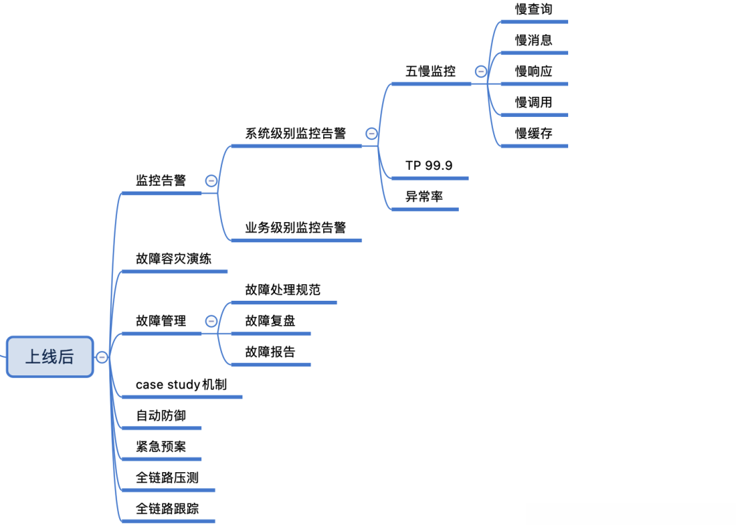 当系统成功上线后,很多小伙伴以为工作就结束了,但实际上我们还有不少工作可以做。根据我的经验,在上线后我们能做的稳定性建设包括: