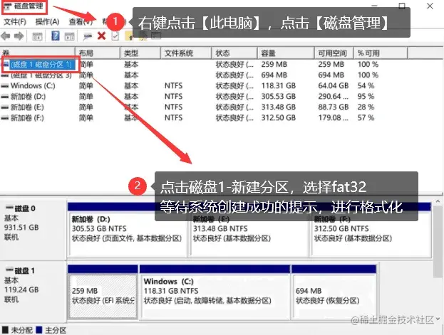 操作步骤: 鼠标右键打开【此电脑】,选择【管理】。再选择【磁盘管理】。点击【磁盘1-新建分区】,再选择【fat32】,等待创建成功,就格式化TF卡了。