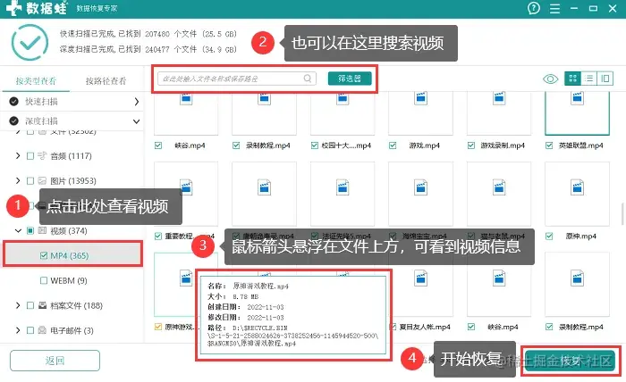 步骤2: 比如我要恢复的是视频,那么就在文件类型那里查找要恢复的视频格式,也可以直接搜索视频的名称(筛选器)。找到视频后,鼠标箭头可以放在视频上方,简单查看相关信息。确认无误,开始【恢复】。