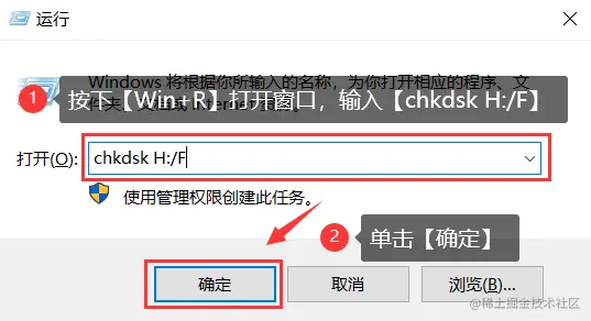 备注:【chkdsk H:/F】里面的H是TF卡的盘符,F是修复参数。