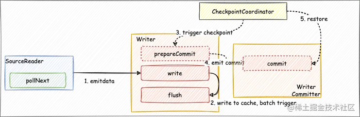 commit:writer在完成数据写入后,committer来完成提交。在不开启checkpoint时,commit会在所有writer都结束后执行一次;在开启checkpoint时,commit会在每次checkpoint的时候都会执行一次。