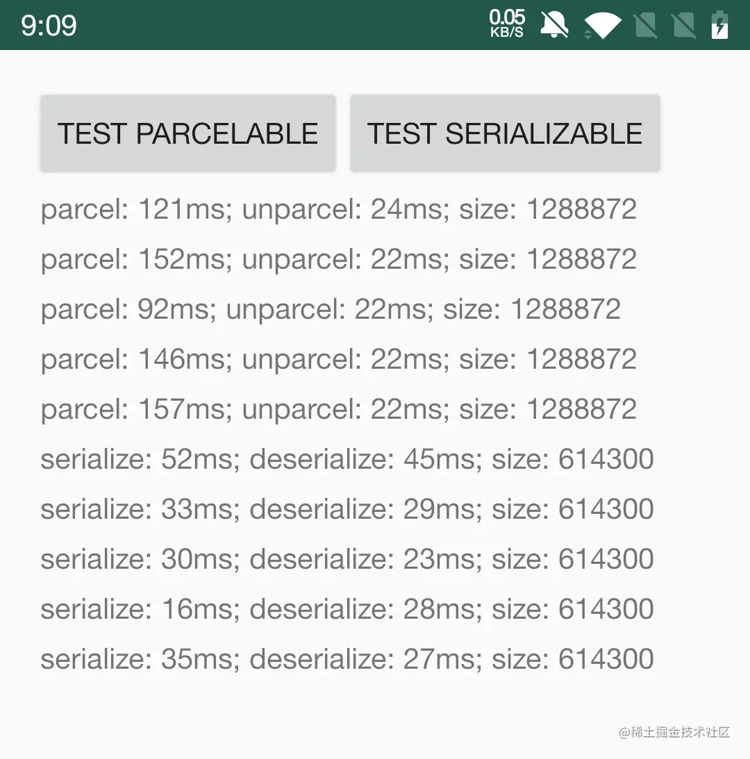 2021-05-29 19:53:33.967 14297-14297/com.ywj.serialtest D/PARCELTEST: Serialiazable: 573微秒; deSerialiazable: 1394 微秒; Size: 103
