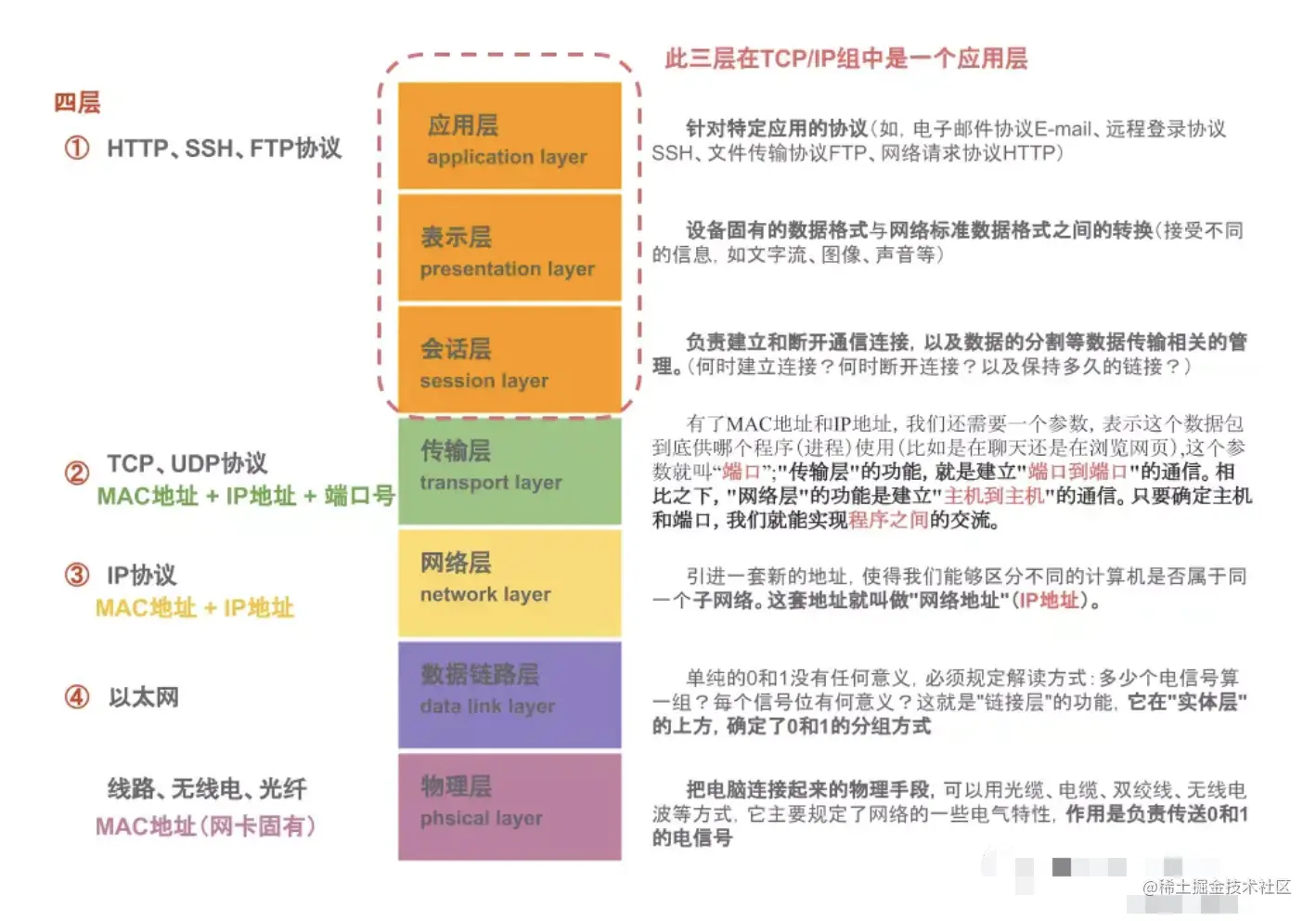 TCP/IP分为四层,核心是二层的IP和三层的TCP,HTTP在第四层;OSI分为七层,基本对应TCP/IP,TCP在第四层,HTTP在第七层;OSI可以映射到TCP/IP,但这期间一、五、六层消失了;- 日常交流的时候我们通常使用