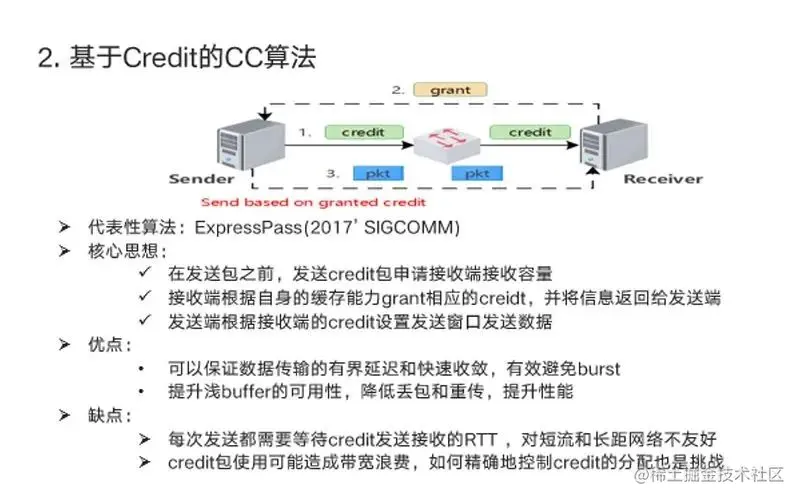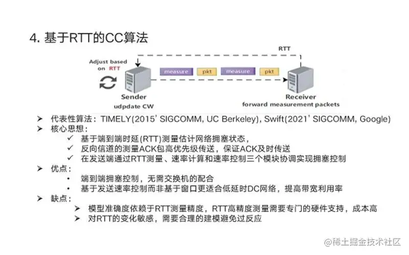 ▍若不依赖交换机的配合,仅依靠网卡本身实现端到端的流控,则基本采用RTT作为拥塞感知的信号,实现拥塞控制;