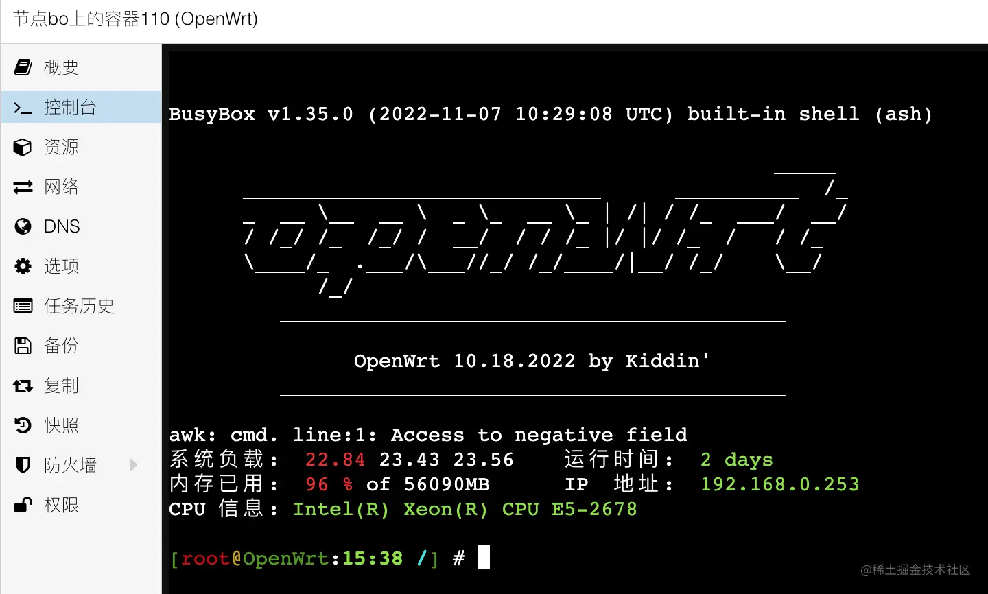 pct create 110\ local:vztmpl/openwrt-10.18.2022-x86-64-generic-rootfs.tar.gz\ --rootfs local-lvm:4 \ --ostype unmanaged \ --hostname OpenWrt \ --arch amd64 \ --cores 2 \ --memory 2048 \ --swap 0 \ -net0 bridge=vmbr0,name=eth0