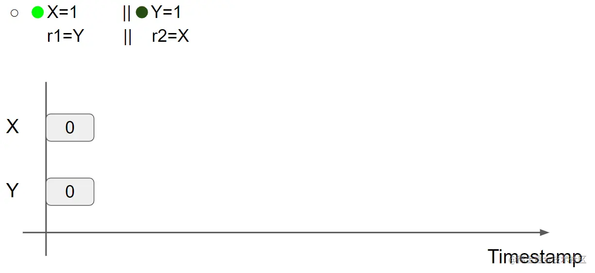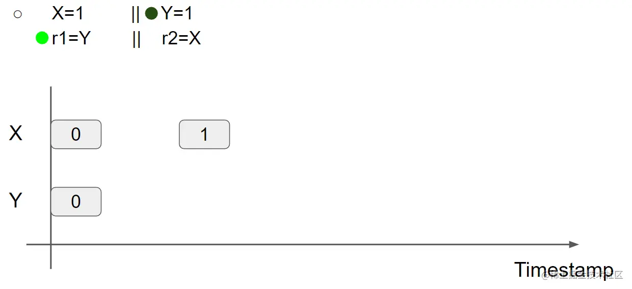 线程1执行 r1 = Y,可以读到 Y = 0 message,因此 r1 = 0: