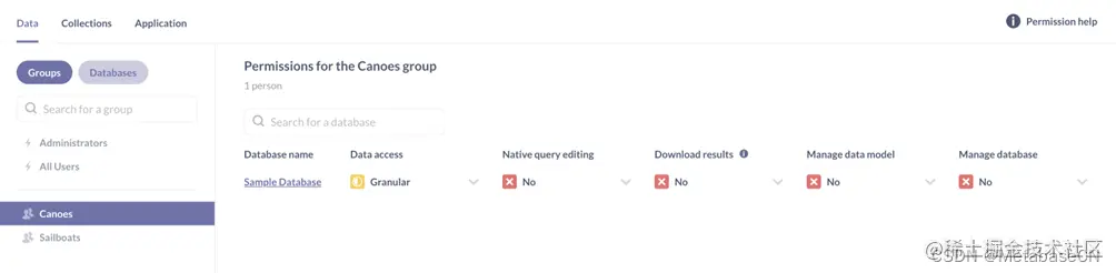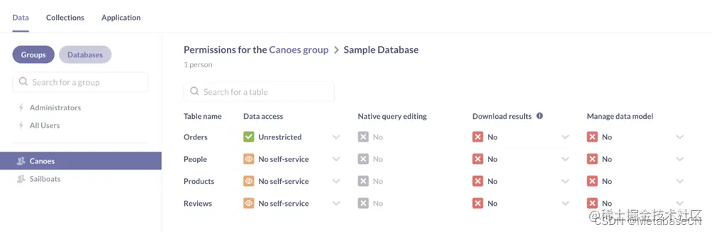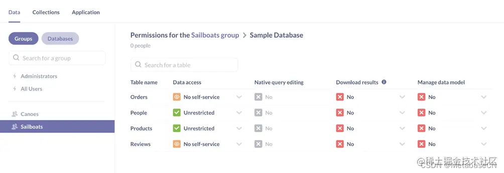 必须为组配置数据权限.Metabase附带两个默认组:Administrators和All Users。我们将创建两个名为独木舟和帆船的新示例组,并将数据权限设置为: