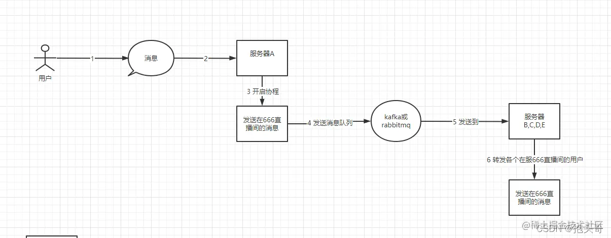 1.假设用户1在服务器A时 发送在666直播间一个消息后,服务器开始处理 开启一个协程 自旋发送 在服务器A 666直播所有人收到这个消息,