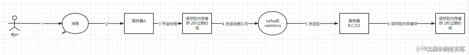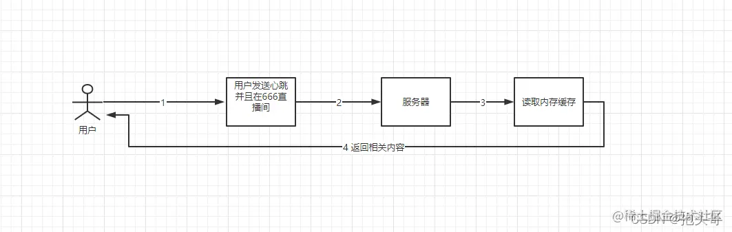 1.假设用户1在服务器A时 发送在666直播间一个消息后,服务器开始处理 开启一个协程 将消息放入内存缓存中2秒过期时间,将有心跳请求并且在666直播间的用户,读取内存缓存(读取2秒内的数据) 然后塞入到protobbuf 响应给用户,