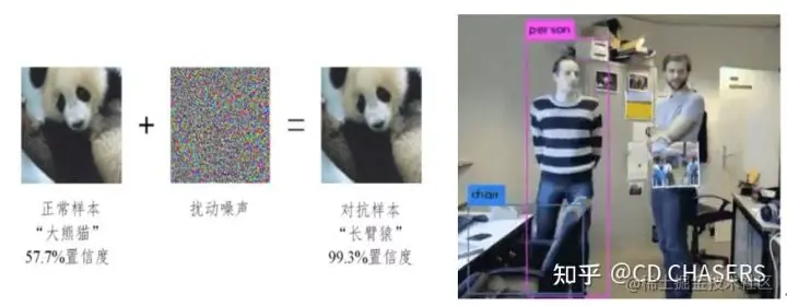 对抗攻击(adversarial attack)是AI安全方向的重要分支,其核心逻辑是在数据中增加一些微小扰 动,在人类视觉系统无法察觉的情况下,使得算法模型对这些数据产生误判。其中被增加扰动的数据 也称为对抗样本。比如下面添加噪声识别大熊猫案列,和下面人体检测中添加人体画像等,都会导致错误案列识别或识别不到。