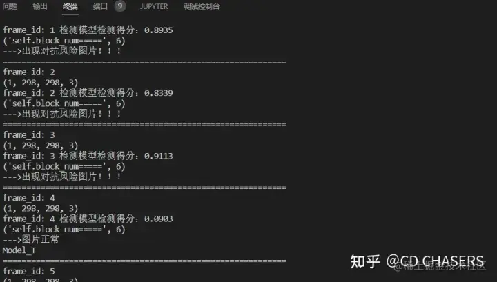 2、视频操作展示。视频流展示结果如下所示。输出终端显示风险图片与正常图片提示。告警端出现了一系列的告警提示。