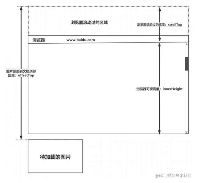 - 内容达到显示区域的:img.offsetTop < window.innerHeight + document.body.scrollTop;