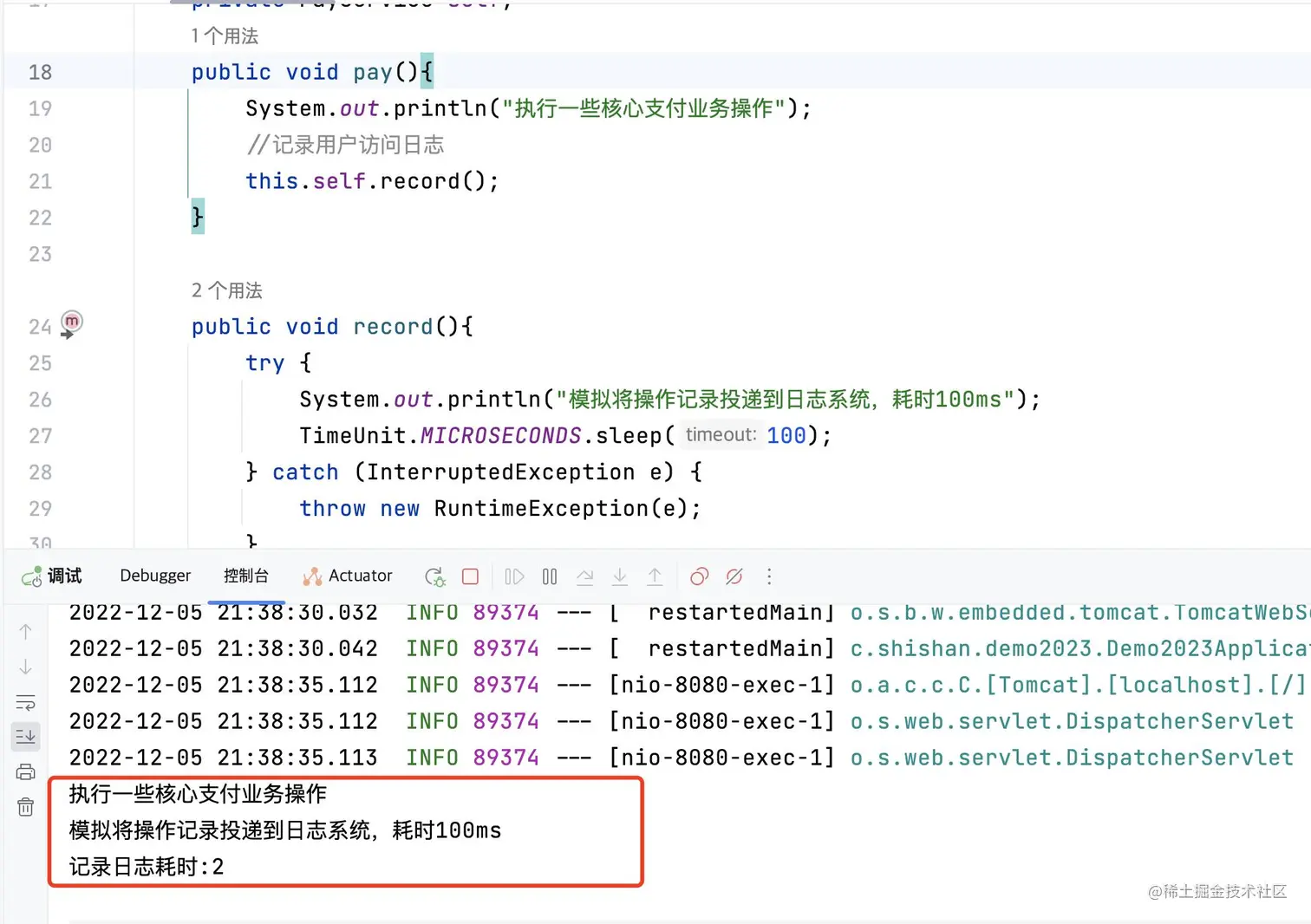 切面类很简单,通过@Around方法对record方法进行切入切出,并记录该方法的执行时间。