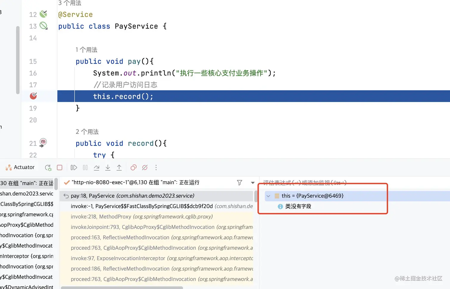 我们可以看到,图中的this指向的是一个普通的PayService对象,而不是被Spring增强后的bean。