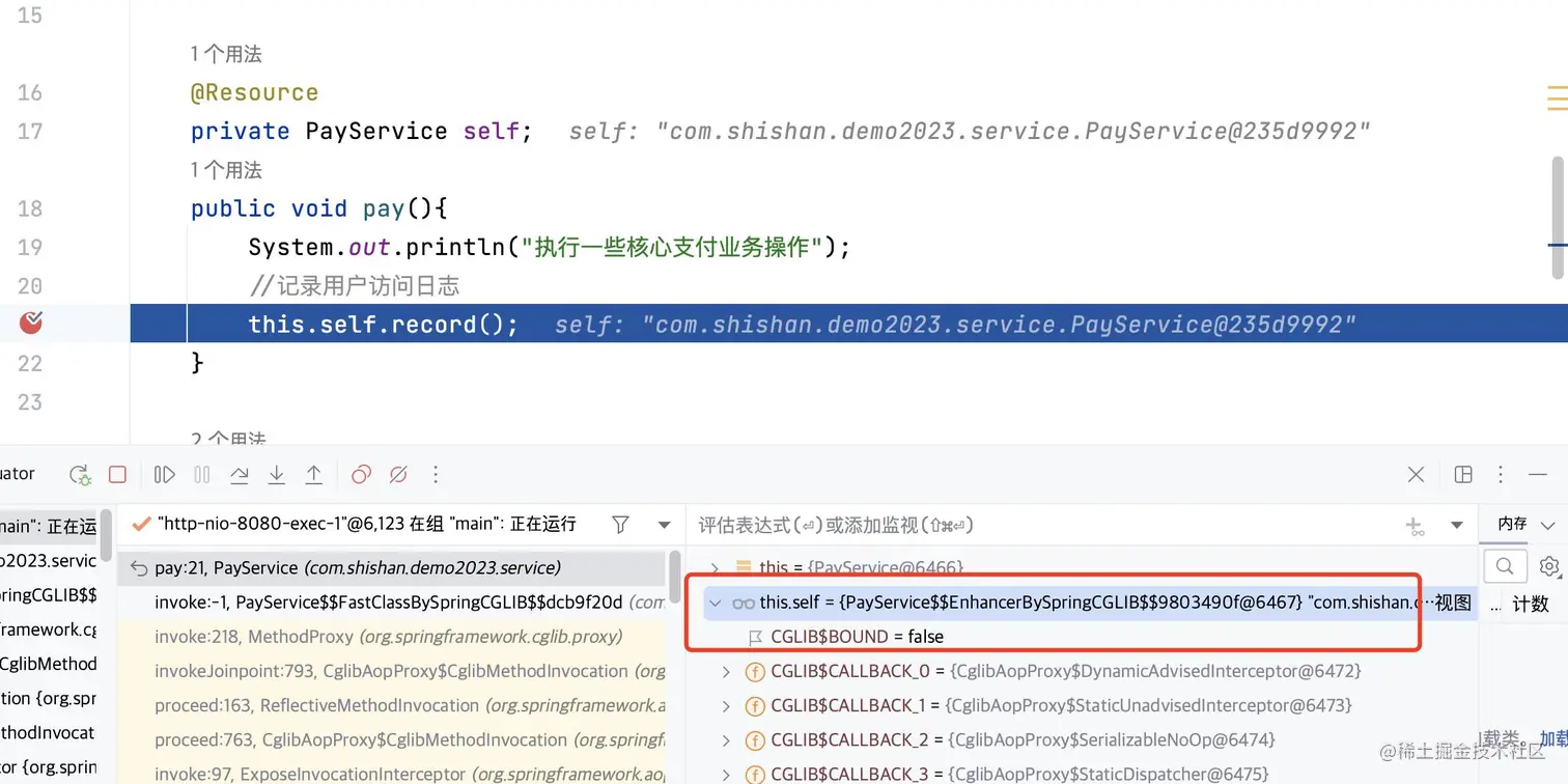 可以看到,在controller中的payService是一个被SpringCLlib增强后的代理类,而我们通过this引用到的,对于Spring来说只是一个普通的bean对象,自然无法实现AOP的功能。