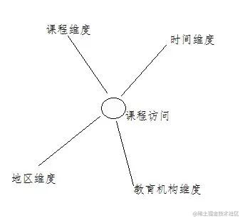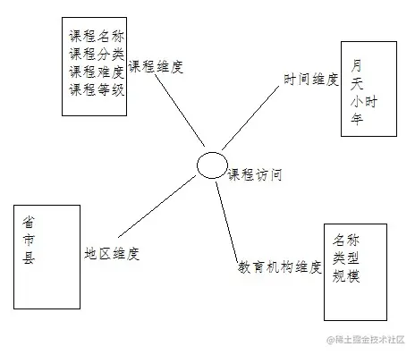 维度是数据仓库建模的基础,维度是在分析时从多个方面来进行分析,根据上边的例子,将课程访问作为度量,识别的维度包括:课程、时间、机构、课程分类等,如下图: