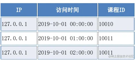比如:按时间分析课程访问量,时间维度是课程访问量的分析依据,时间维度和业务中的课程访问量是对应的,下表列出了课程访问量明细记录: